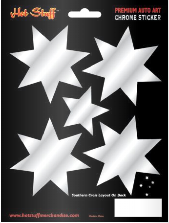 Chrome, die-cut stickers of Aussie Southern Cross star constellation. Package size: 6″X8″